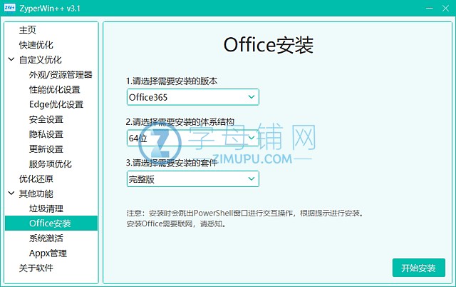 ZyperWin++是一个轻便的Windows优化工具,适用于Win7-Win11最新版的优化,包括性能优化、服务项优化、垃圾清理等操作,还支持系统激活和Office快速安装。