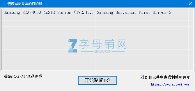 运行服务端,选择要共享的打印机,点击“开始配置”。配置成功后,将生成:
