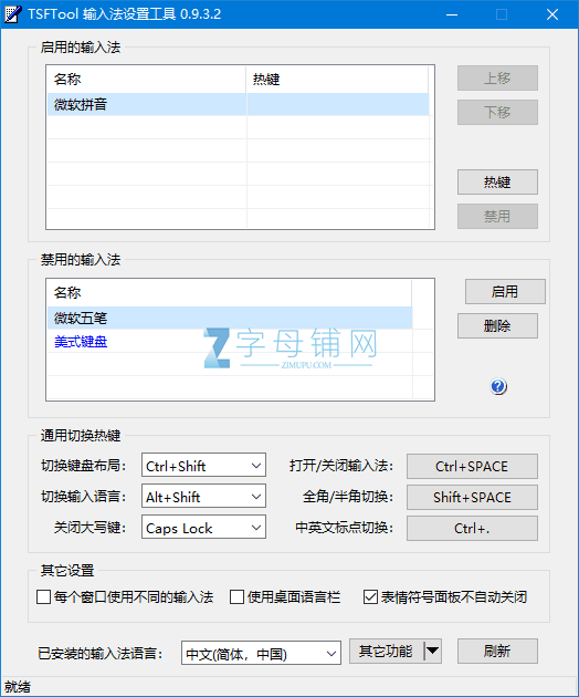 7. 偶尔会出现工具里的输入法列表和实际的输入法列表不太一致的现象,来回调整几次刷新刷新就会正常。主要原因是因为 Windows 在语言选项中的输入法列表和任务栏上的输入法列表是两个不同的配置,有时候条目数量和顺序会不一致,通过输入法工具设置会纠正这个问题。