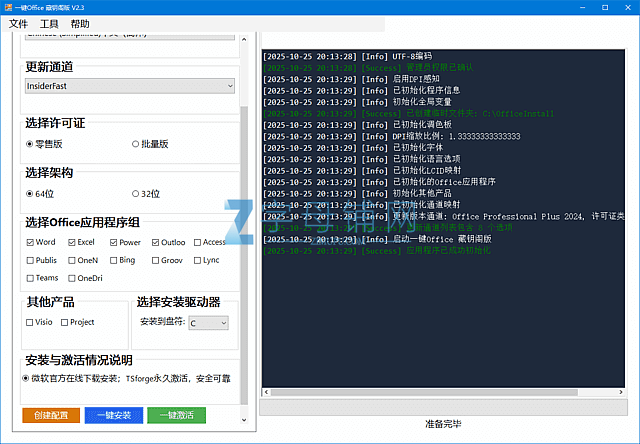 集成 “创建配置 – 一键安装 – 一键激活”全流程功能,从安装配置到激活操作,无需复杂手动步骤,小白用户也能轻松完成 Office 部署,大幅降低技术门槛。