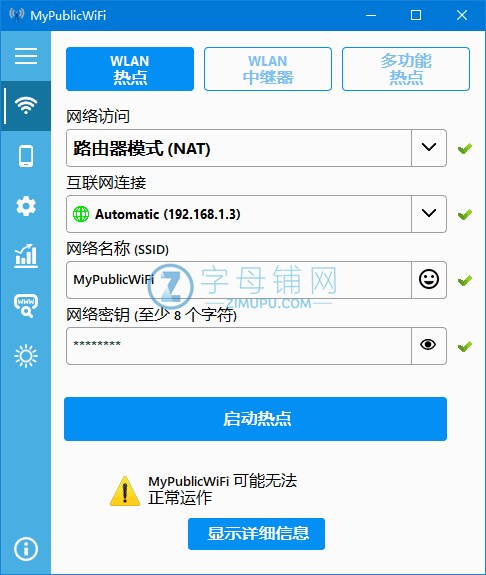 MyPublicWiFi是一款免费的虚拟WiFi热点软件,可以将电脑或笔记本电脑的无线网卡转换成一个WiFi热点,让其他设备可以连接上该热点进行上网。
