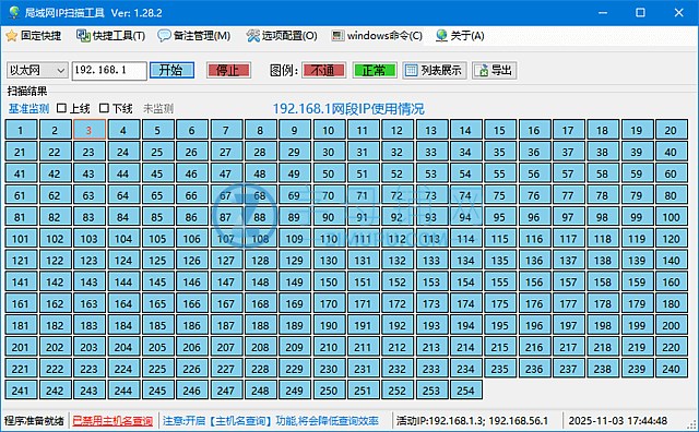 1. 主菜单的IP段扫描,通过Ping检查网络通讯状态,当Ping失败时可通过TCP端口侦测状态,支持状态外观的自定义,支持查询包括IP、计算机名称、Mac地址,并提供常用的网络调试命令。