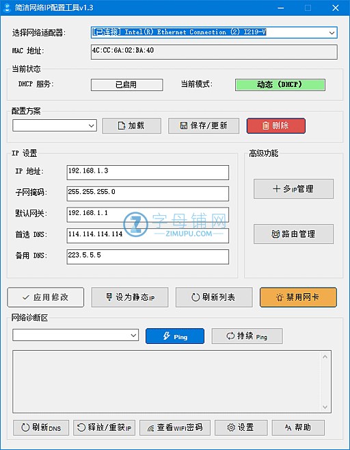 内置 Ping 工具,支持单次和持续 Ping 测试,还能一键刷新 DNS 缓存、释放 / 重新获取 IP,快速排查网络问题。