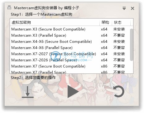 3、根据您的Mastercam版本,选择对应的虚拟狗版本,然后在下方根据需要选择“安装/卸载”、“启用/停用”或“重启”。
